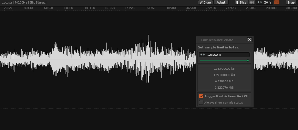 LowResource is a program to monitor the size of all samples in Renoise. Just set the highest allowed size and the program will take care of it.